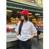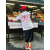 Triko v bílé barvě s ČERVENÝM potiskem na zádech, volného střihu. Vyrobeno z příjemného, lehkého materiálu.